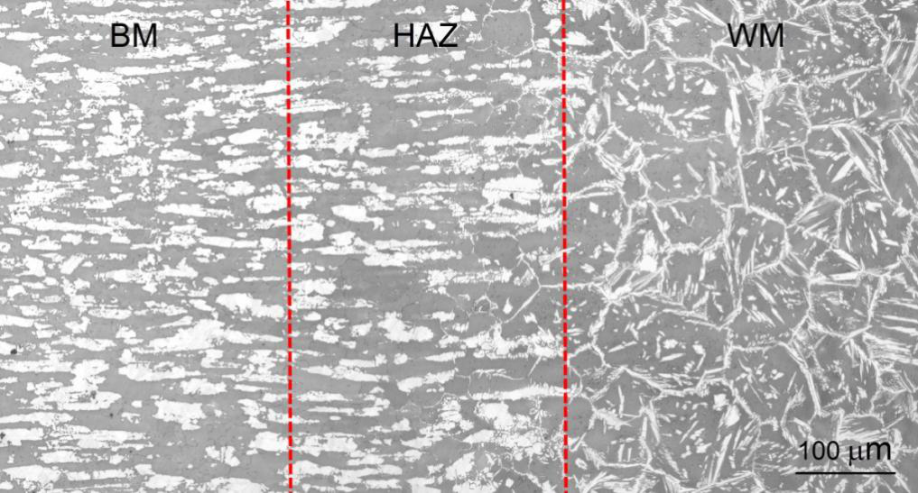 焊接過程是一個(gè)快速加熱與快速冷卻的熱循環(huán)過程。焊接接頭的組織可以分為三個(gè)部分:熔合區(qū)、熱影響區(qū)和母材。雙相不銹鋼的熔合區(qū)為鑄態(tài)組織,屬于鐵素體凝固模式,一次凝固相為單相鐵素體。焊接接頭的熱影響區(qū)根據(jù)距離焊縫熔池距離不同可分為高溫?zé)嵊绊憛^(qū)和中低溫?zé)嵊绊憛^(qū)。高溫?zé)嵊绊憛^(qū)幾乎為單相鐵素體組織,高溫?zé)嵊绊憛^(qū)的兩相比例一方面取決于鋼的化學(xué)成分,另一方面取決于焊接熱輸入、冷卻速度度等因素。中低溫?zé)嵊绊憛^(qū)基本上處于兩相平衡區(qū),在冷速較慢的情況下,可能會(huì)產(chǎn)生金屬間析出相。熱影響區(qū)晶粗大且易于產(chǎn)生析出相,大大降低了材料的沖擊性能和點(diǎn)蝕性能。